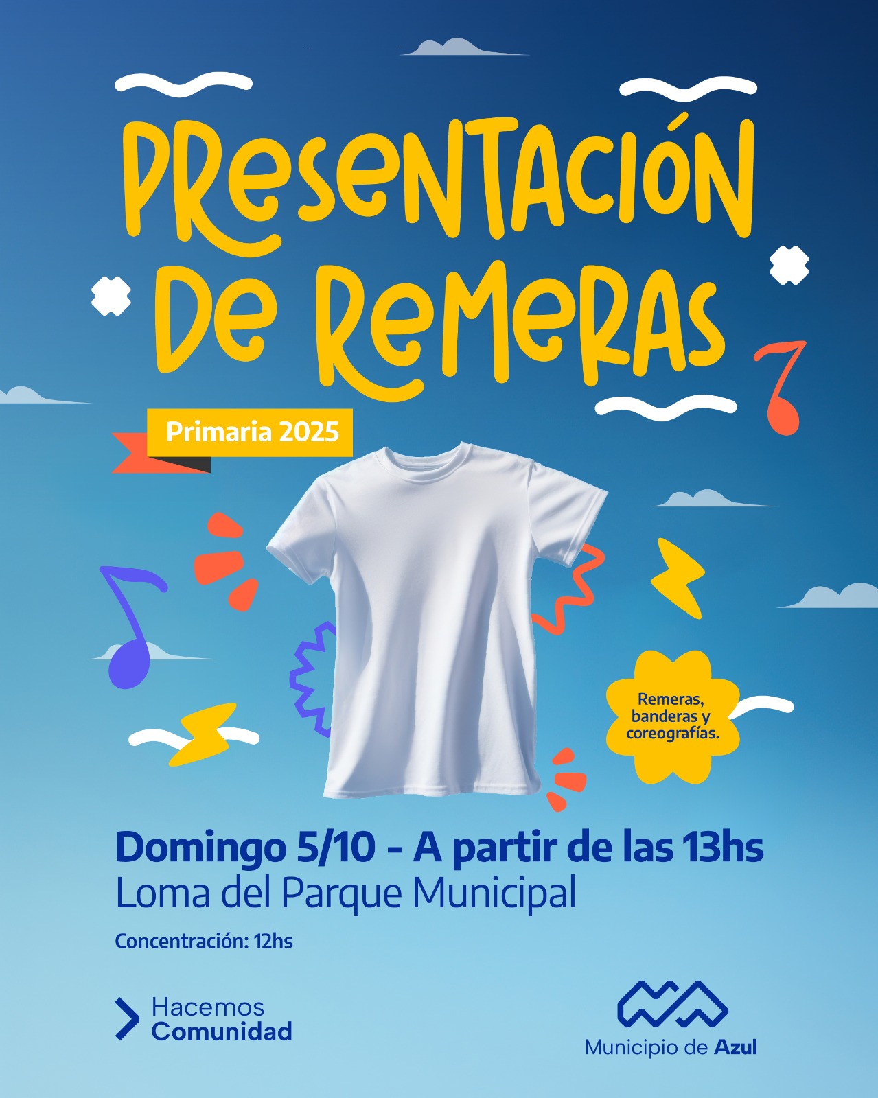 El Municipio de Azul informa que la presentación de remeras de la Promo 2025 de las escuelas primarias tendrá lugar el domingo 5 desde las 13, en la Loma del Parque Municipal.