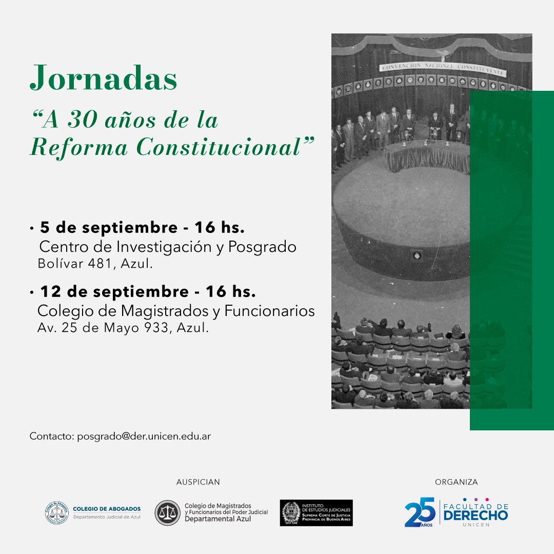 La Secretaría de Investigación y Posgrado de la Facultad de Derecho de Azul invita a la comunidad a participar de las jornadas “A 30 años de la Reforma Constitucional”.