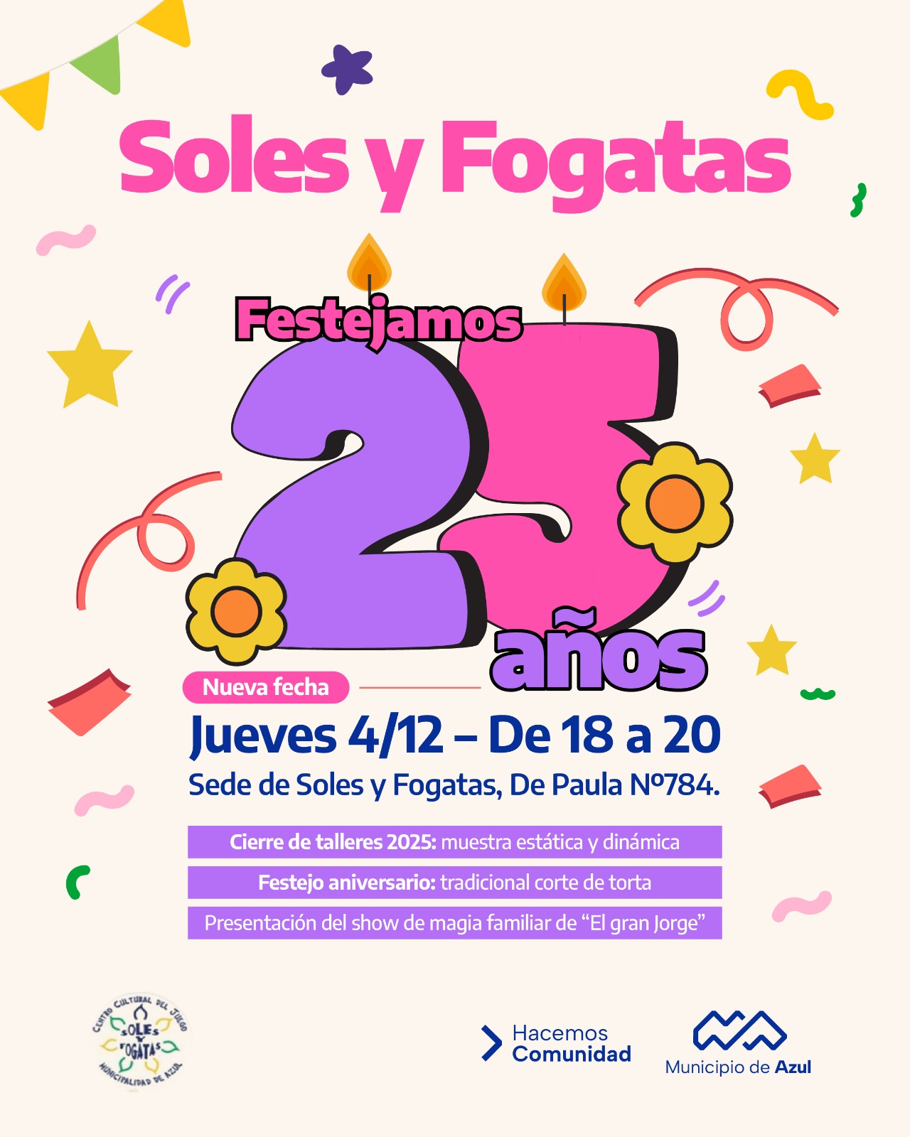 El Municipio de Azul invita al cierre de talleres 2025 del Centro Cultural y Comunitario “Soles y Fogatas” que se realizará mañana jueves, de 18 a 20, en la sede ubicada en De Paula Nº 784.