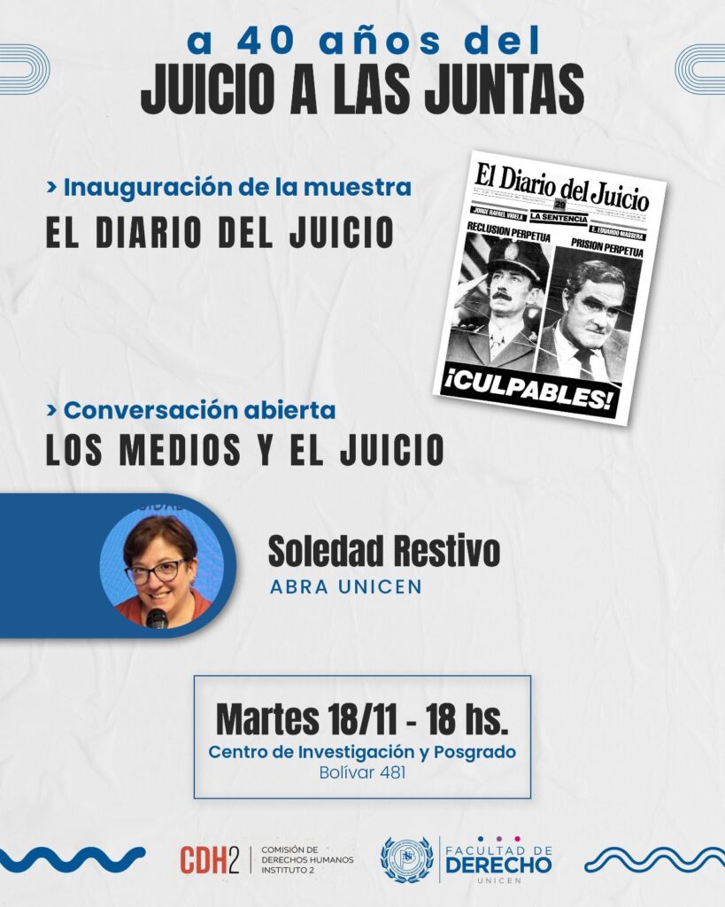 Luego, se llevará adelante la conversación abierta “Los medios y el juicio”, a cargo de Soledad Restivo, integrante de ABRA UNICEN, quien abordará el rol del periodismo, la construcción mediática y el impacto social del Juicio a las Juntas desde una perspectiva contemporánea.