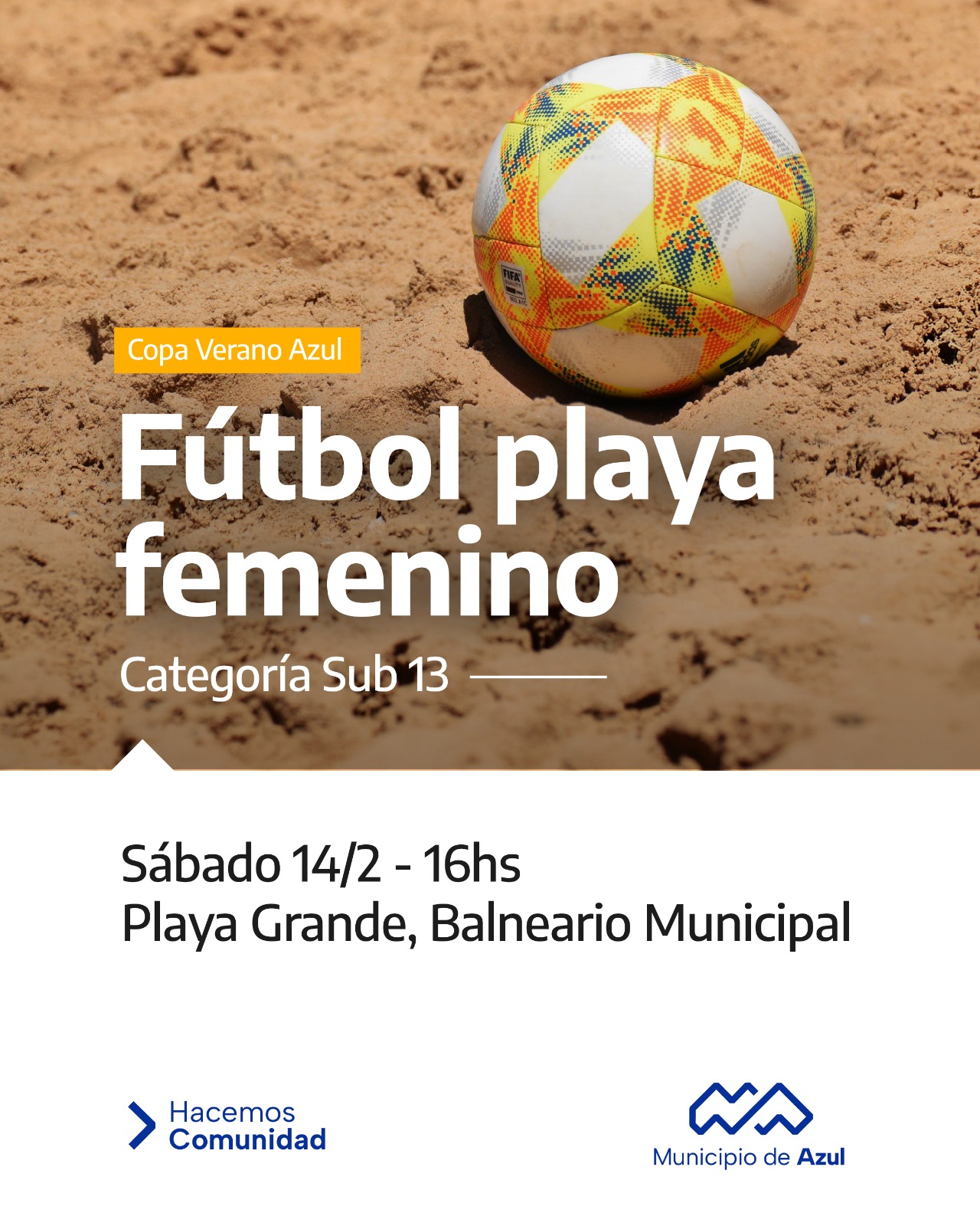 El Municipio de Azul informa que este sábado 14 desde las 16, en el sector de Playa Grande del Balneario Municipal, se realizará la Copa Verano Azul de fútbol playa femenino.