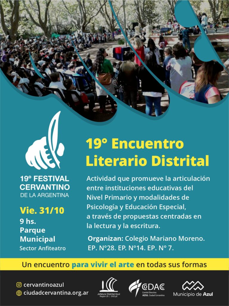 El Municipio de Azul informa que este viernes, a partir de las 9, en el sector del anfiteatro del Parque Municipal, se realizará el 19° Encuentro Literario Distrital.