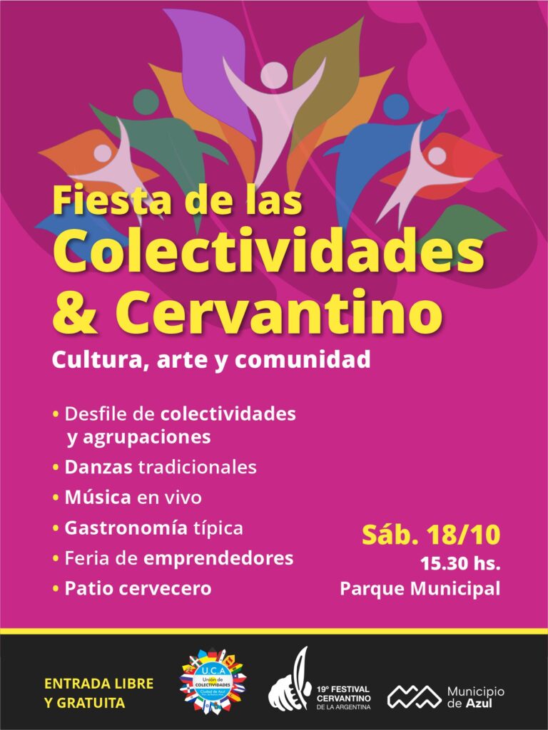 El Municipio de Azul informa que este sábado 18 de octubre, a partir de las 15:30, en el Parque Municipal Domingo F. Sarmiento, se realizará la Fiesta de las Colectividades y el cierre del Festival Cervantino, un encuentro para celebrar la diversidad cultural que nos une.