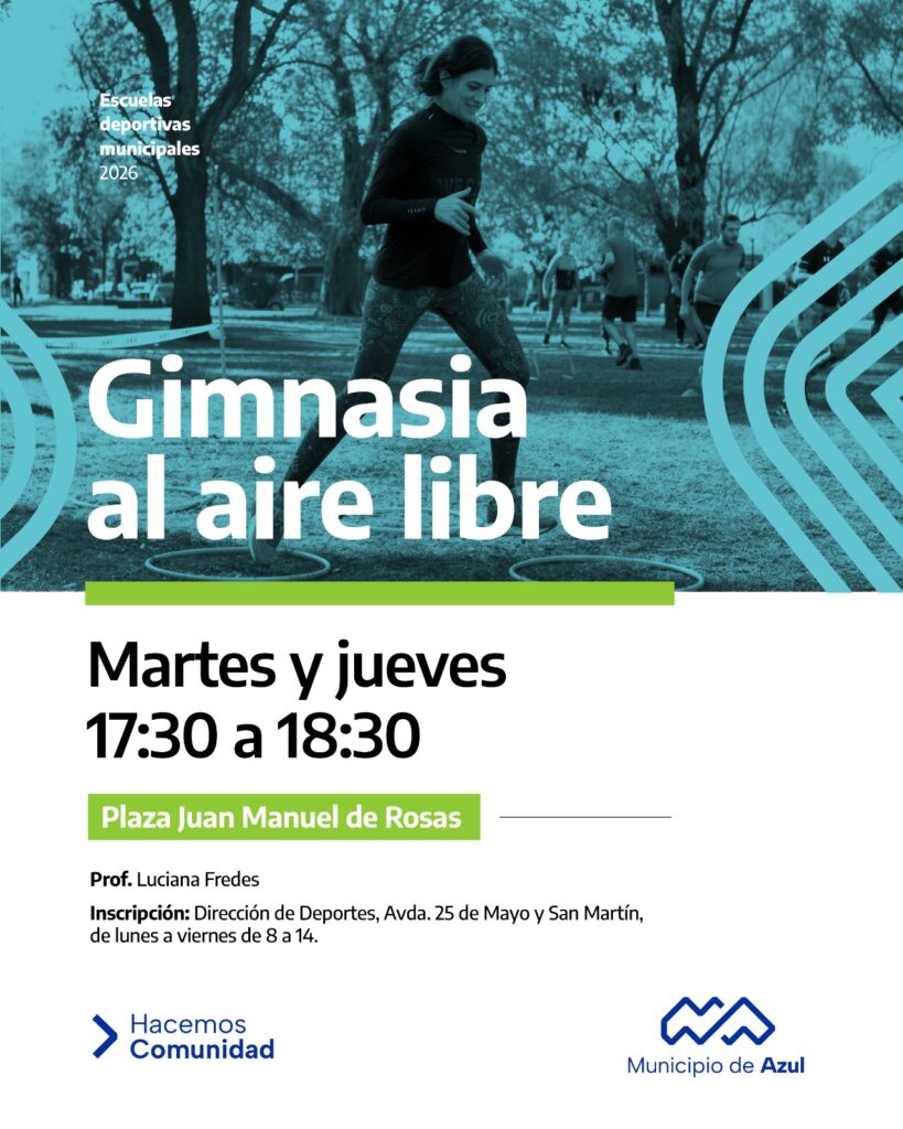 El Municipio de Azul informa que desde el 14 de abril en la Plaza Juan Manuel de Rosas, se dictará gimnasia al aire libre, la nueva propuesta que se incorpora a los espacios deportivos que ofrece la Dirección de Deportes de la comuna.