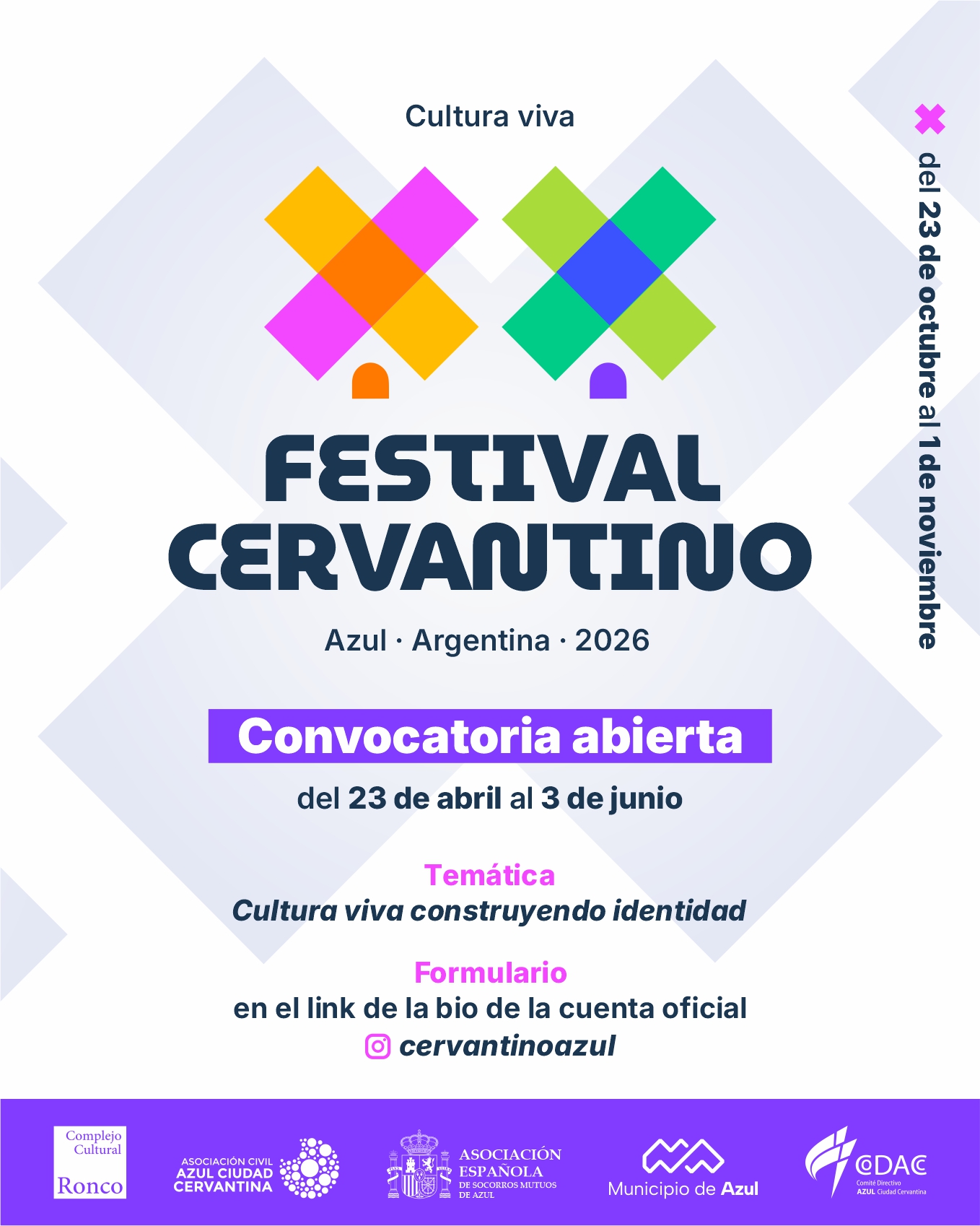 En tanto, las personas interesadas en anotarse deberán completar el formulario disponible en https://forms.gle/TKUcN1U6nwBuTAax6 o ingresar desde la cuenta de Instagram@cervantinoazul. Para acceder a más información podrán comunicarse al correo electrónico festivalcervantinoargentina@gmail.com.