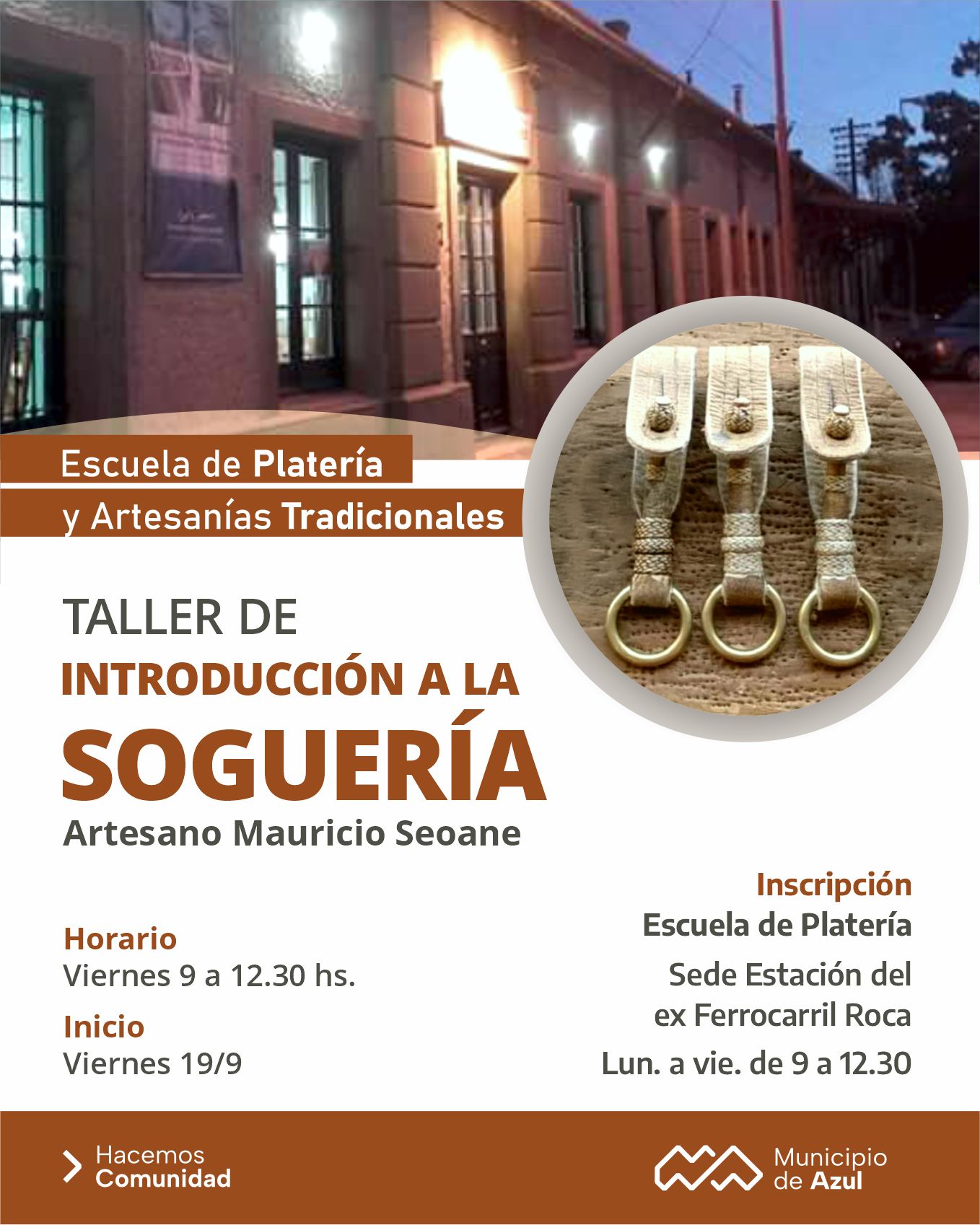 El Municipio de Azul informa que se encuentra abierta la inscripción para el taller de Iniciación a la Soguería a cargo del artesano Mauricio Seoane en la Escuela de Platería y Artesanías Tradicionales. El mismo consiste en el manejo y la preparación del cuero, técnicas de corte y trenzado y elaboración de productos.