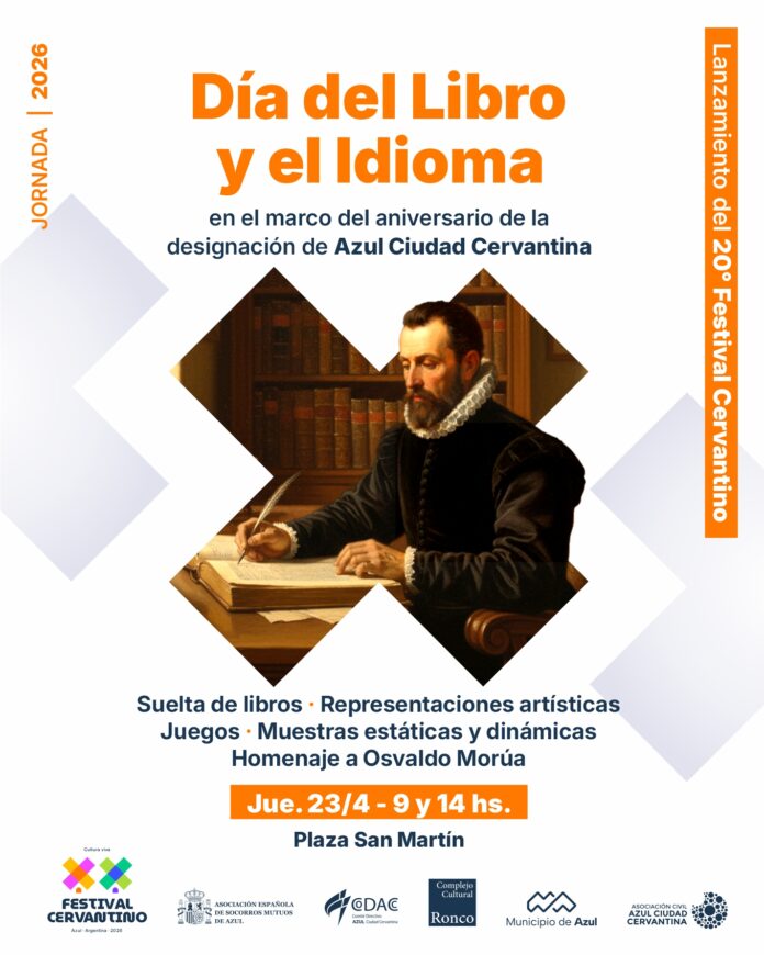 El Municipio de Azul invita a toda la comunidad a participar de la jornada que se realizará este jueves 23, en conmemoración del Día del Libro y del Idioma, en el marco del aniversario de la designación de nuestra ciudad como Ciudad Cervantina de la Argentina.