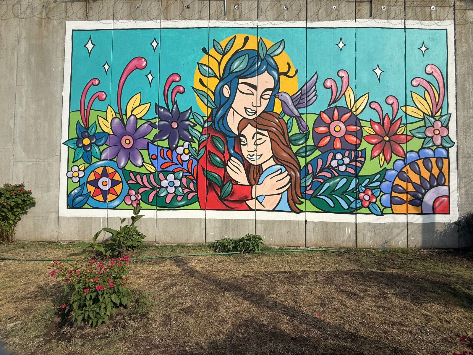 cuando las conocí, me contaron sobre el poema que hicieron en conjunto. Trata sobre la mujer adulta que es hoy, hablándole a la niña interior, la niña que habita adentro y forma parte del pasado vivido.  fueron palabras fuertes las que expresaron cuando me lo leyeron, y una frase de ese poema me quedo resonando… “aunque no pueda cambiar el pasado, estoy en tu presente” esa mujer de hoy cuida y abraza, dando la contención que necesitó y que no pudo tener. A partir de esa idea arme el diseño. Quería expresar ese abrazo, con un gesto de armonía y aceptación por lo vivido. Usar colores llamativos, que transformen el lugar e impregnen de energía transformadora el espacio. En la imagen dibuje un colibrí, que es el nombre del pabellón y representa la libertad. A partir de allí, nos pusimos manos a la obra.