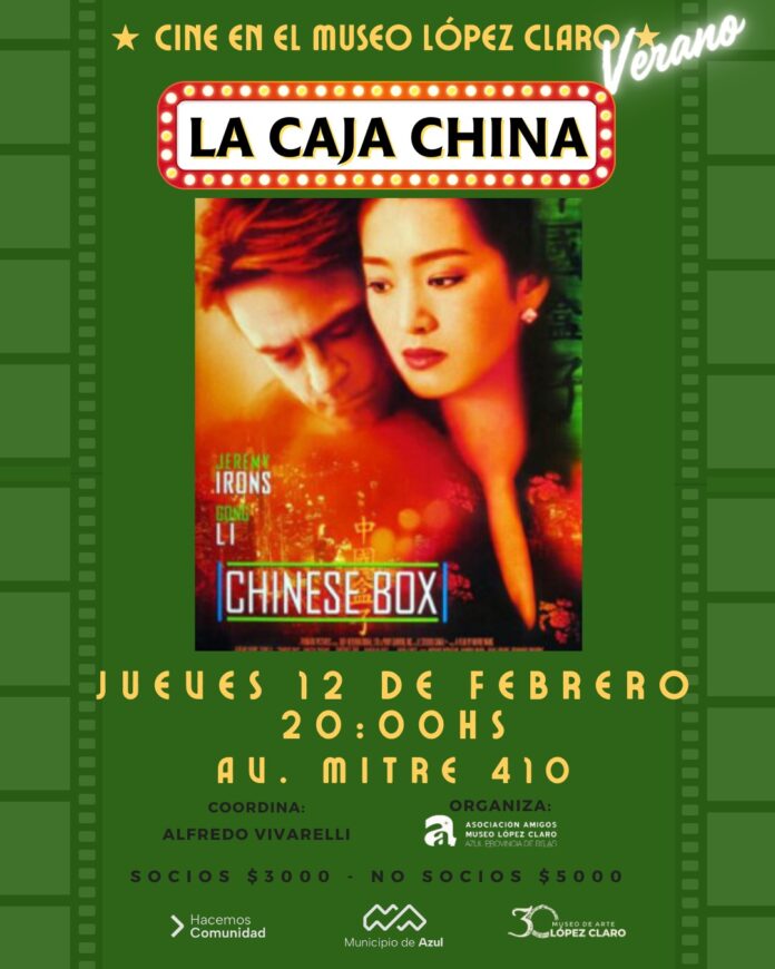En la ocasión, se proyectará la película “La Caja China” (Chinese Box/Francia-Japón-EE.UU, 1997), dirigida por Wayne Wang y protagonizada por Jeremy Irons, Gong Li y Maggie Cheung. El film se presentará en versión original con subtítulos, en color y tiene una duración de 1 hora y 40 minutos.
