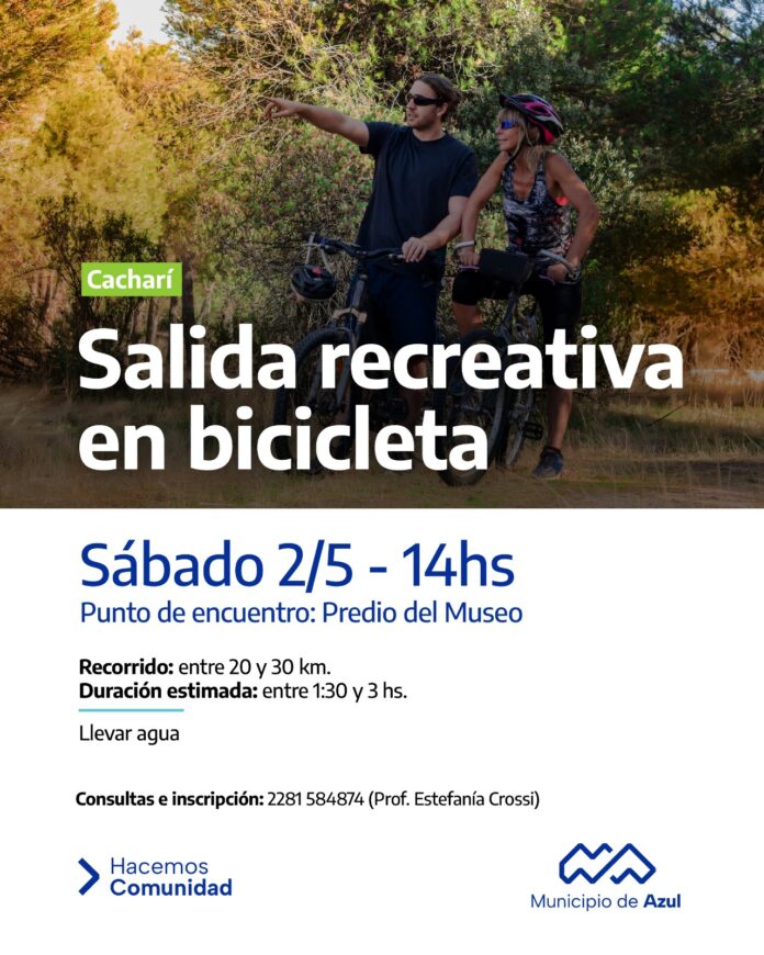 El Municipio de Azul informa que la salida recreativa en bicicleta por Cacharí, anunciada oportunamente, se realizará el sábado 2 de mayo a las 14, y no en la fecha y horario originalmente indicados.