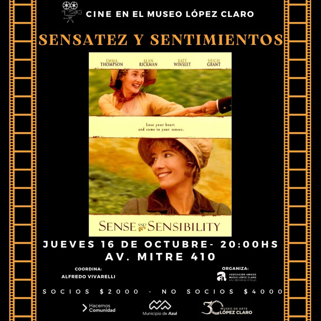 El Municipio de Azul invita a la comunidad a participar de una nueva edición del ciclo de cine que organiza el Museo Municipal de Arte López Claro que tendrá lugar mañana jueves a las 20 en la sede de Av. Mitre 410 con la proyección de la película “Sensatez y sentimientos”.