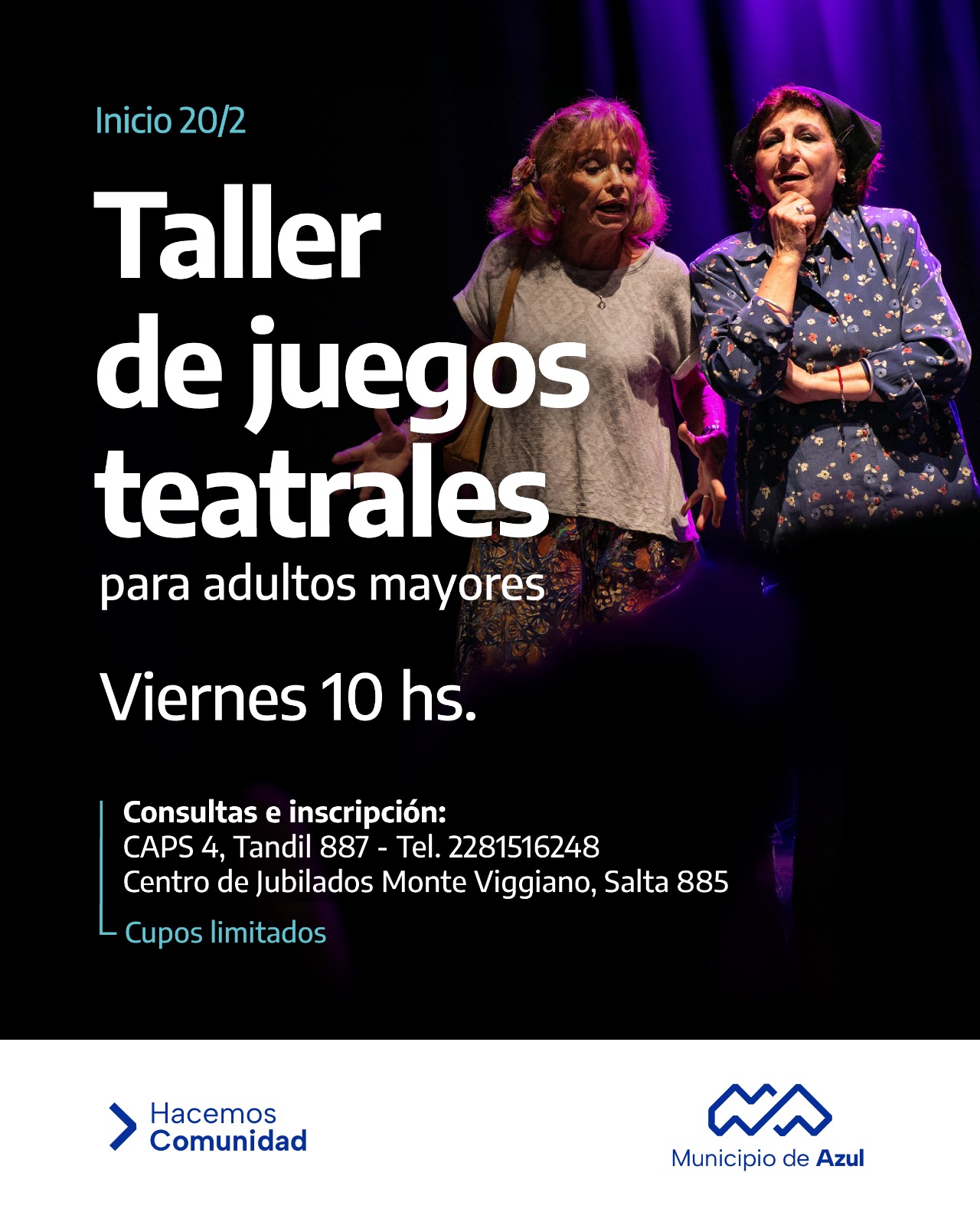 El Municipio de Azul informa que el viernes 20 de febrero comenzará el taller de juegos teatrales para adultos mayores, en el Centro de Jubilados Monte Viggiano, ubicado en Salta 885.